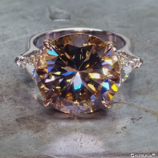 Discover the captivating elegance of our Brown Diamond. This unique piece features a stunning 6.5ct brown diamond nestled between dazzling trillion sidestones. Set in platinum with exquisite 18K yellow gold prongs, this jewel exhibits a harmonious blend of color and texture. A timeless addition to any collection, this piece radiates a warmth and brilliance that will enhance any ensemble.