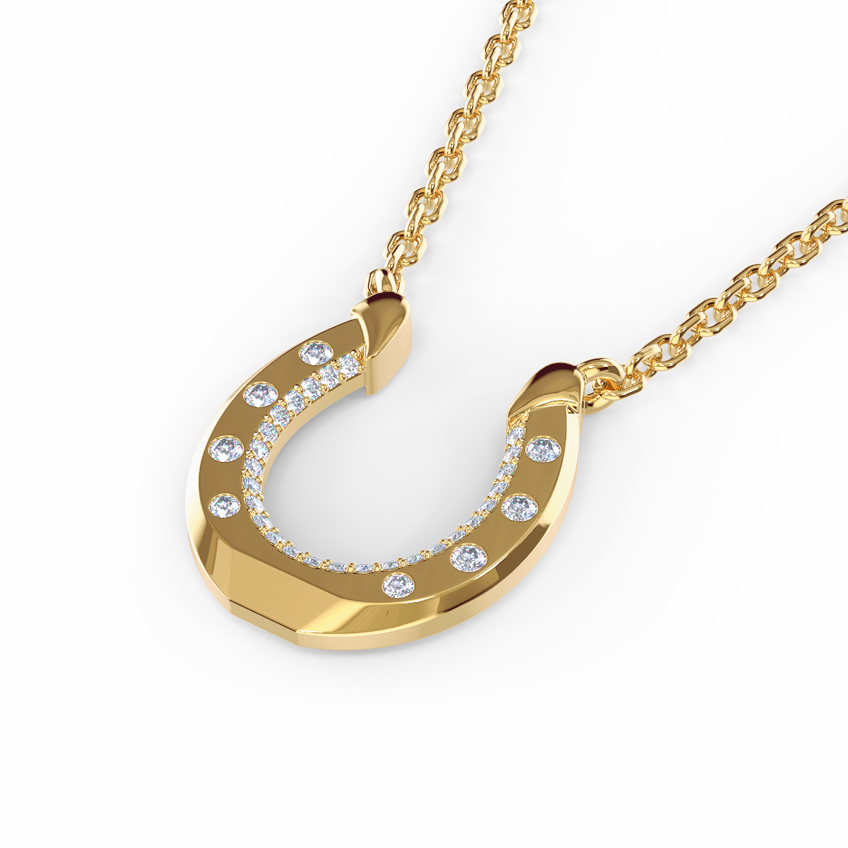 Introducing our Diamond Encrusted Horseshoe Necklace, a symbol of luck and timeless beauty. Crafted with meticulous attention to detail, this necklace features a horseshoe pendant adorned with shimmering diamonds, set in exquisite 18k yellow gold. Each diamond is carefully selected and expertly set to create a captivating display of light and brilliance. The 18k yellow gold chain adds a touch of warmth and sophistication, enhancing the necklace’s allure. For a personalized touch, choose between two chain lengths: 16 inches or 18 inches. Select the length that perfectly suits your style and preference, allowing the necklace to gracefully adorn your neckline with effortless grace.